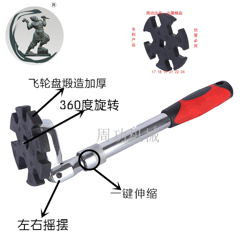 周功根據市場及客戶需求,自主研發(fā)了四輪定位專用扳手,倒鉤槽防滑落、再加360度旋轉和90度左右搖擺、不滑落又能用上力,還可隨意更換規(guī)格尺寸,只要一把扳手難拆銹死的前束螺絲就迎刃而解了。